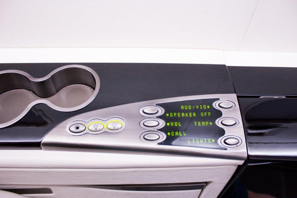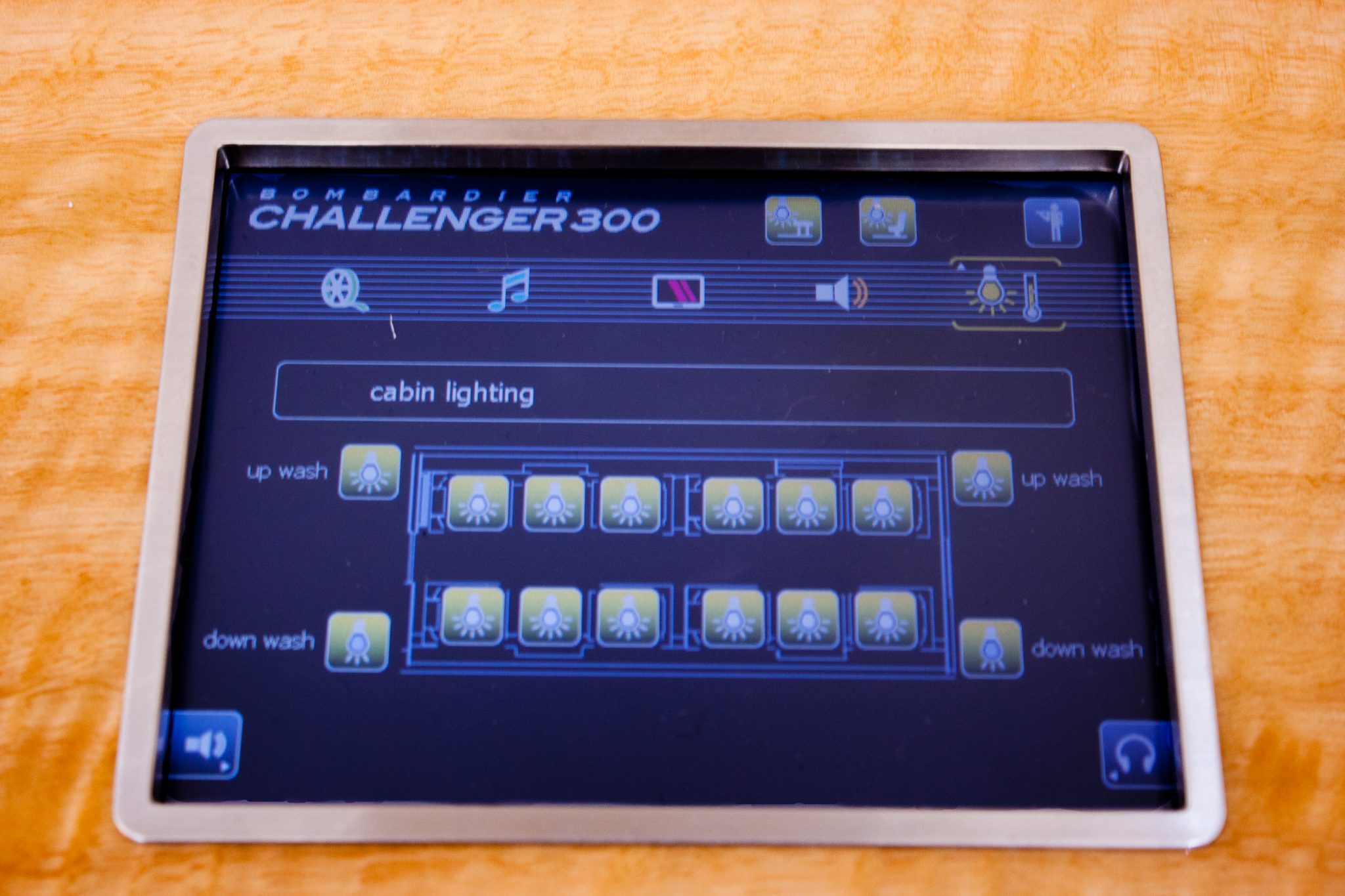 Older Challenger 300s have push button cabin controls at one of the seats.